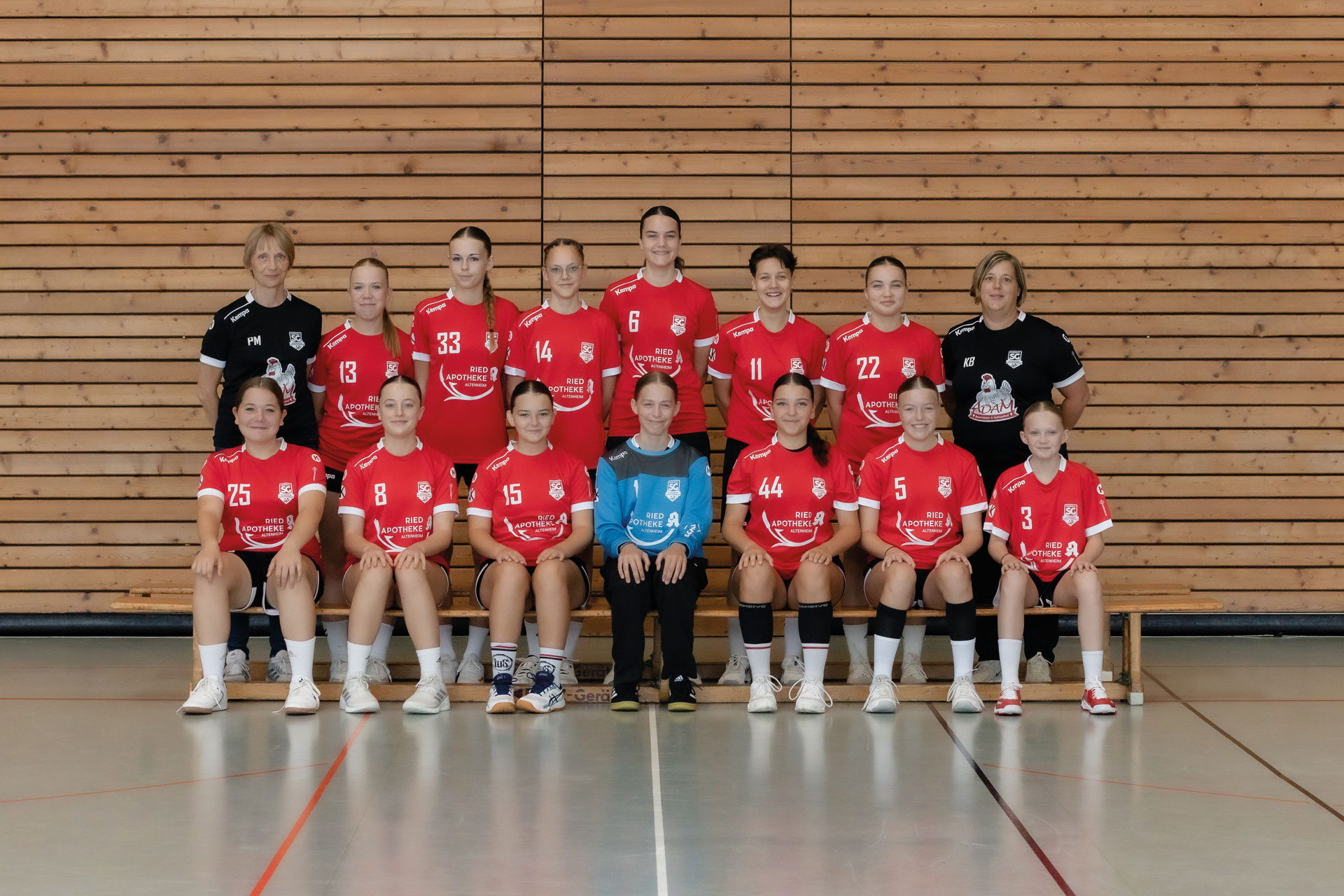 Hintere Reihe v.l.n.r.: Petra Mild (Trainerin), Amelie Schäfer, Mia Karkutsch, Anna Dolch, Enya Runge, Sarah Hetzel, Smilla Fels, Katrin Bayer (Trainerin)